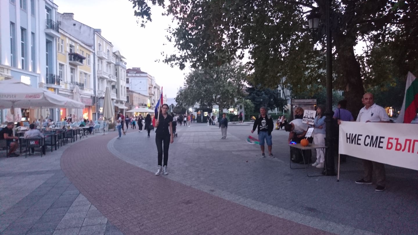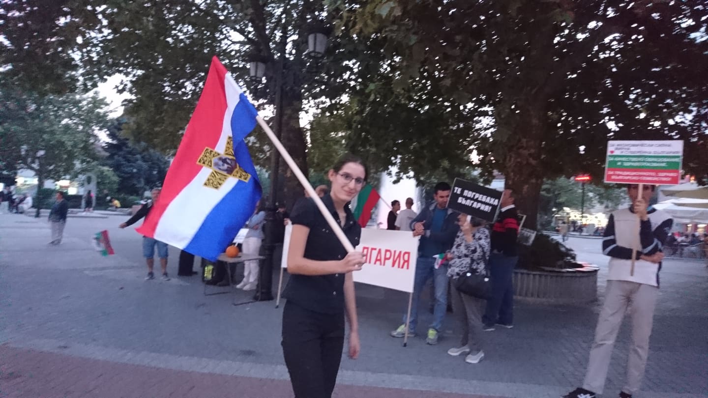 В същото време под дърветата на Главната течеше редовният протест на русофилите. Докато те скандираха „Мутри вън“, девойка дефилираше пред тях със Самарското знаме.