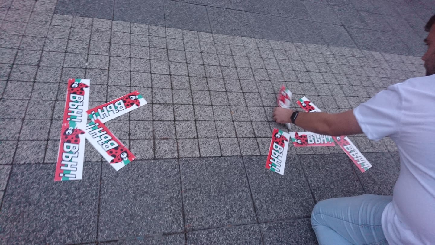 После изписаха със стикери пред входа на сградата „Калинки“ и изрисуваха стрелка, сочеща навън.